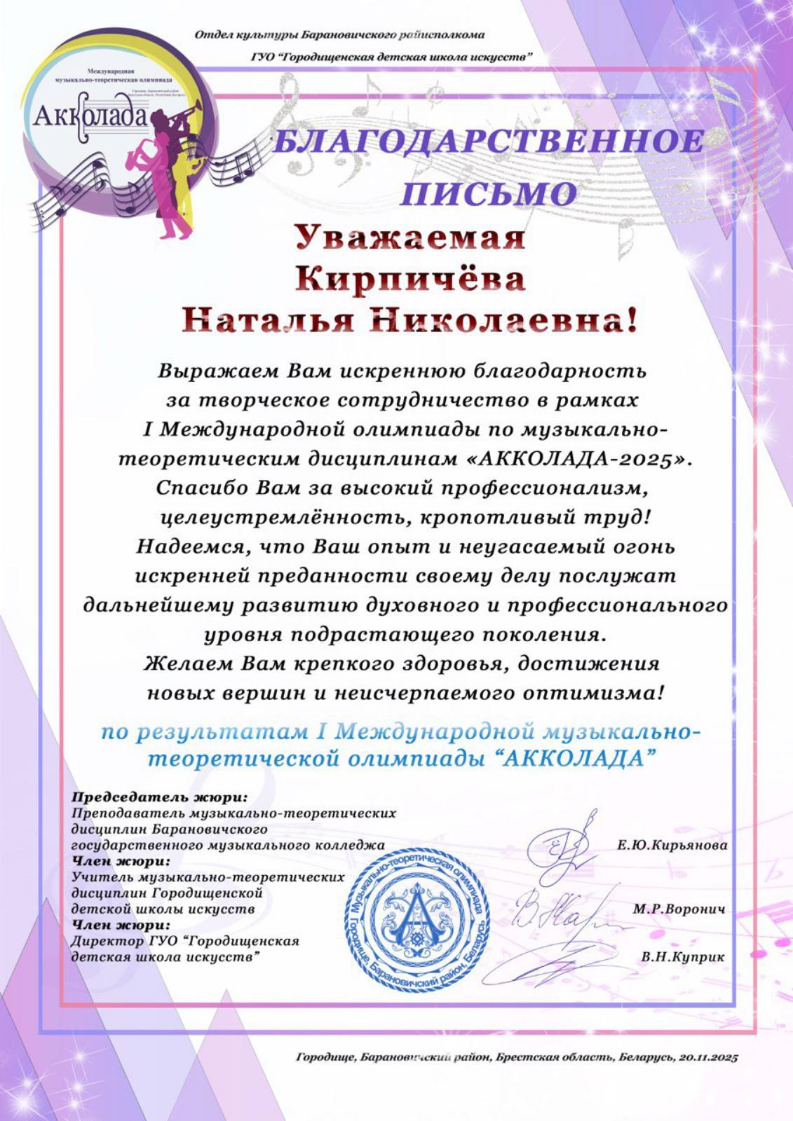 В Барановичах в последние дни ноября 2025 года подвели итоги Международной олимпиаде по музыкально-теоретическим дисциплинам «АККОЛАДА» (дистанционная форма). Поздравляем наших ребят! В номинации «Сольфеджио» они
