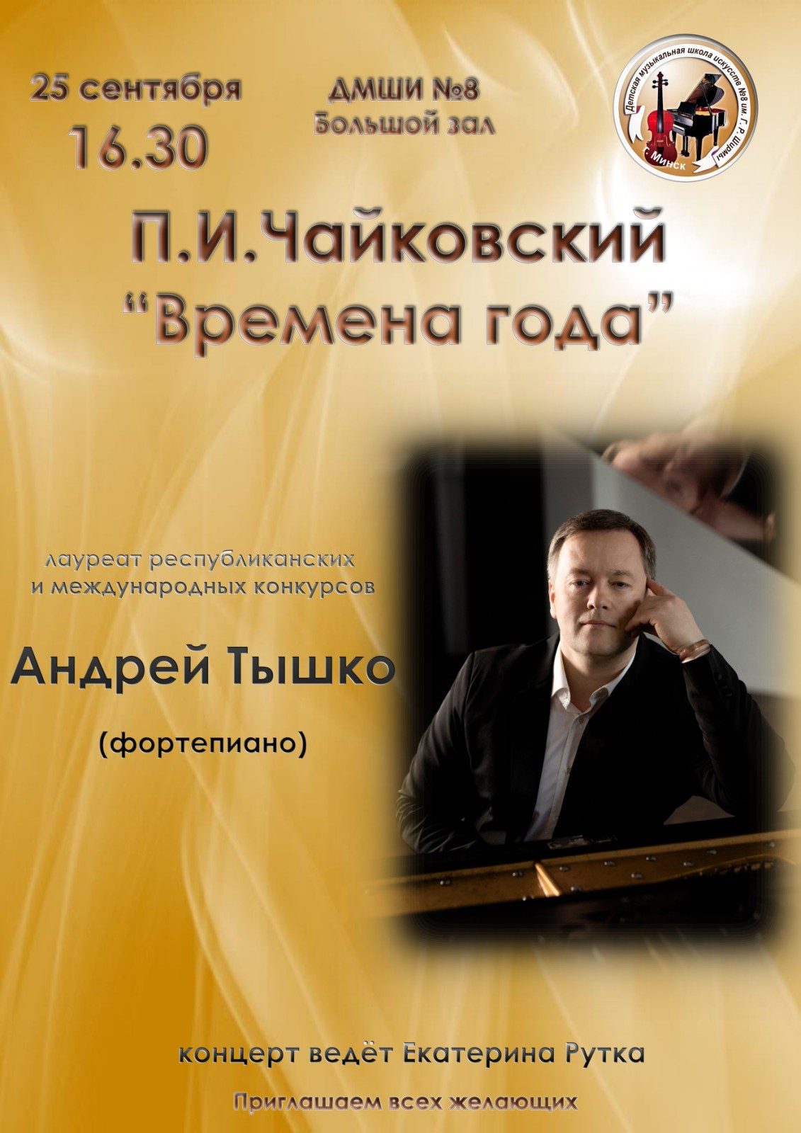 25 сентября в 16.30 в Большом зале с концертной программой П.И. Чайковский «Времена года» выступит лауреат республиканских и международных конкурсов — Андрей Тышко (фортепиано). Концерт