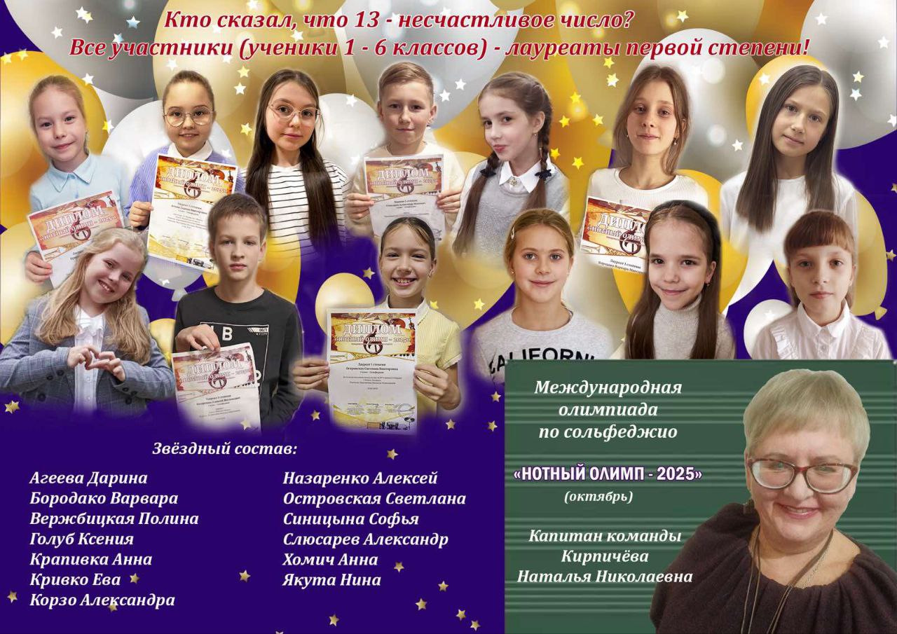 В октябре ученики Н.Н. Кирпичёвой приняли участие в Международной олимпиаде по сольфеджио «Нотный олимп – 2025» (онлайн). Так же участвовала ученица Е.В. Рутка — Голуб