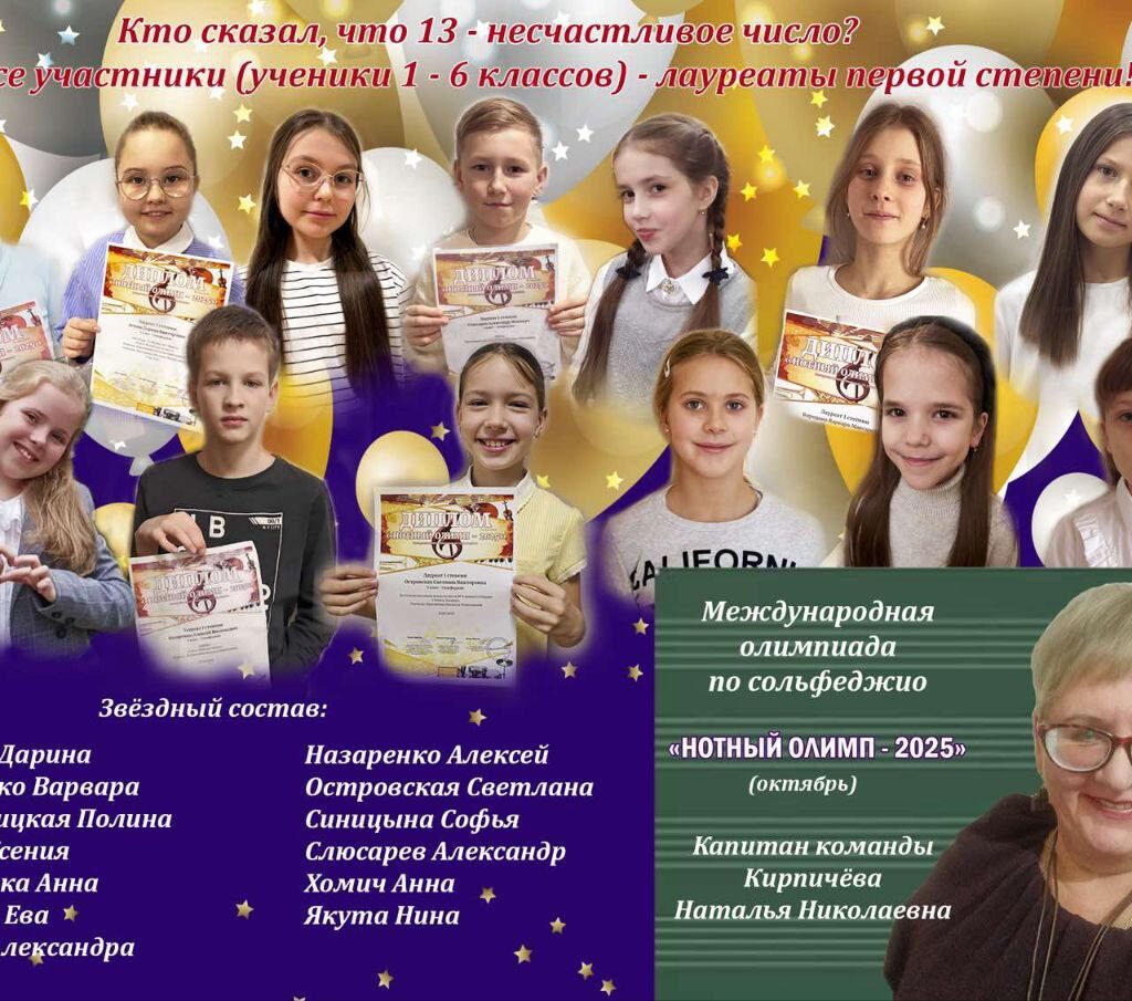 В октябре ученики Н.Н. Кирпичёвой приняли участие в Международной олимпиаде по сольфеджио «Нотный олимп – 2025» (онлайн). Так же участвовала ученица Е.В. Рутка — Голуб Валерия (4/5 кл.). Все участники стали лауреатами I степени. Поздравляем!