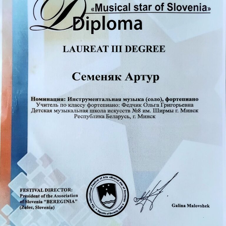Артур Семеняк (учитель Ольга Григорьевна Федчик) стал лауреатом III степени на Третьем Международном фестивале искусств «Musical star of Slovenia» в номинации «Инструментальная музыка. Соло» Наши